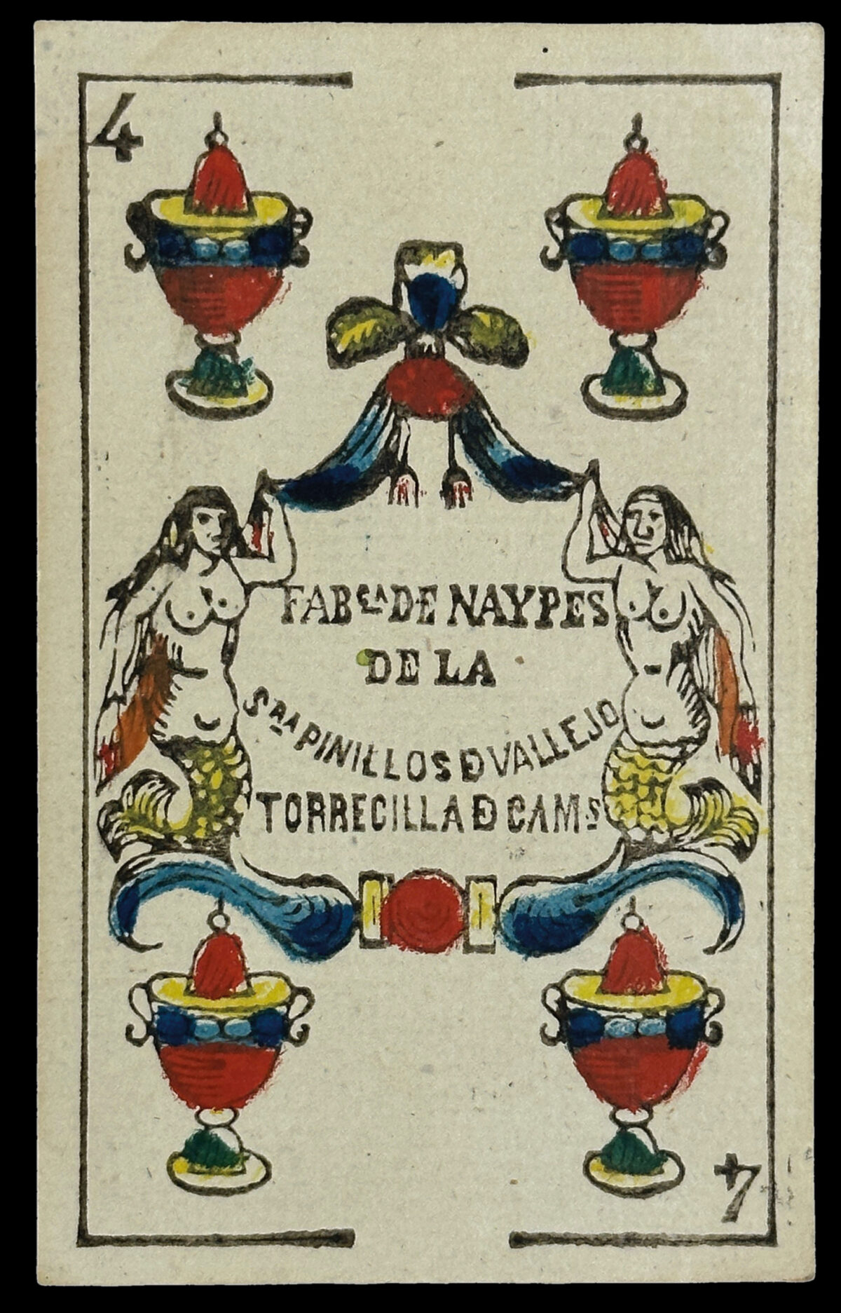 During the second quarter of the nineteenth century, Raimundo García designed and produced playing cards in Madrid, bringing out a unique design which maintained his reputation throughout the remainder of the century. García often delegated production of his cards to other workshops, meaning that similar decks are found from a variety of makers, albeit giving credit to the original designer. The present deck names both García and the manufacturer, Señora Pinillos de Vallejo, whose imprint appears on the Four of Cups. Pinillos de Vallejo took over the family business in 1852 after the death of her husband, Manuel Maria de Vallejo, whose name is also found on the wrapper of this deck. Under her direction, the business continued to operate for the next two decades.