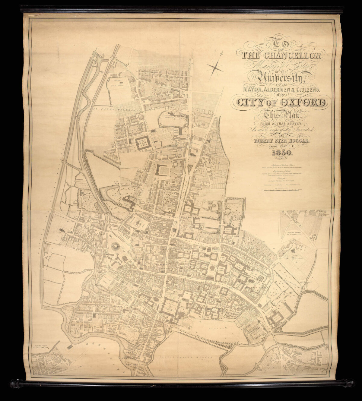 To the Chancellor, Master and Scholars of the University and the Mayor, Aldermen, & Citizens of the city of Oxford, This Plan from Actual Survey is most respectfully inscribed by Robert Syer Hoggar, Assoc. Inst. C.E. 1850