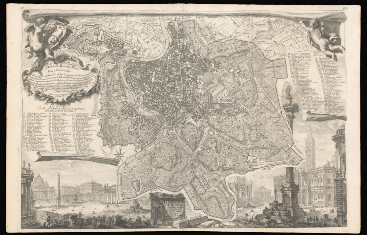 The map's borders are almost entirely taken up by lavish ornamentation, finely engraved by the celebrated Venetian artist Giovanni Battista Piranesi. There are a pair of putti in the upper corners, one of whom is holding the dedicatee's coat of arms while the other unfurls a trompe l'oeil scroll bearing the map and its key. The lower left corner contains a view of Saint Peter's Basilica, Bernini's spectacular piazza and the Vatican obelisk. The lower right corner shows Roman ruins surrounded by more recently constructed Renaissance and Baroque monuments, such as Santa Maria Maggiore and the Trevi Fountain. The foreground of these views is taken up by ancient ruins, contrasting starkly with the more orderly grandeur of the Renaissance and Baroque architecture in the background. The title of the map appears as an inscription on one of these ancient ruins, and the map's scale and engravers' signatures can be found hiding on a stray pediment.