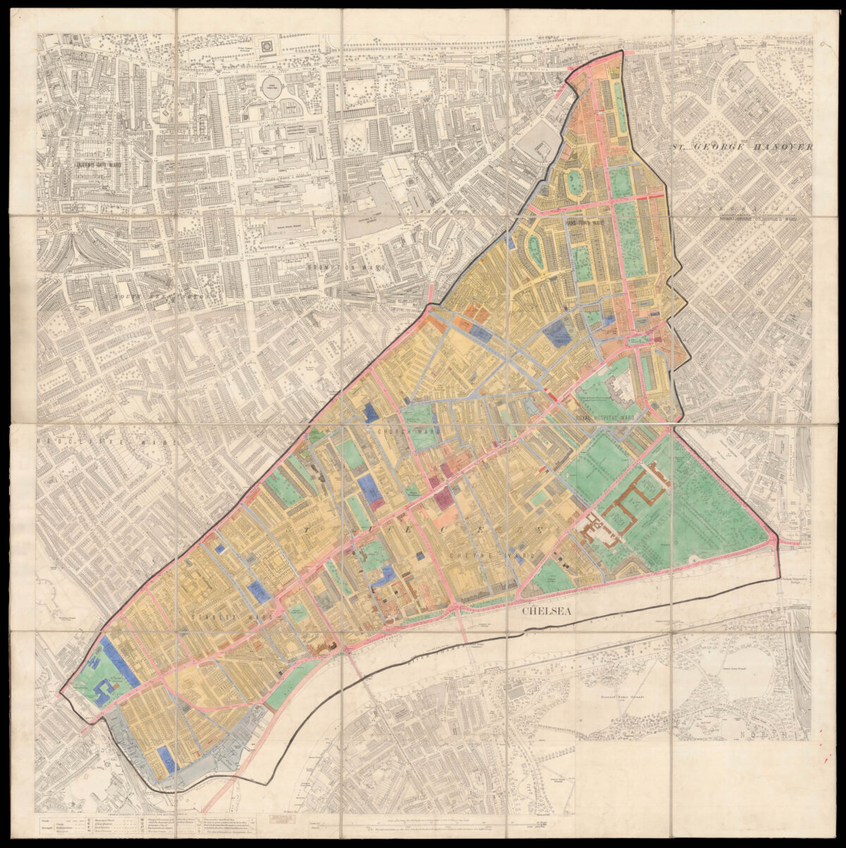 An unusual map of the parish and historical borough of Chelsea. A thick black line denotes the outline of the "Union, Parly. & Met. Boro. Bdy.": Chelsea was made a borough in the London Government Act of 1899, which divided the city into 28 metropolitan boroughs and the city of Westminster. Previously, local government had been overseen by the parish of St Luke's Chelsea, which is also labelled on the map.
