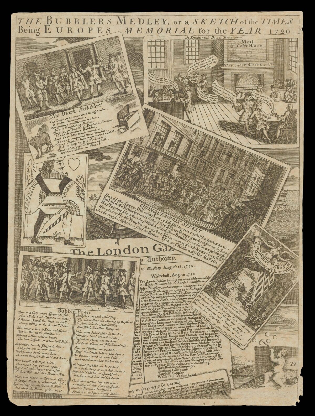 An earlier version of 'The Bubblers Medley' was published by Thomas Bowles II in 1720 (see BM Heal 1880,1113.3953). His nephew, Carington Bowles's reprinted it, but also published his own version,which includes a selection of his firm's "Bubble" playing cards, satirical cartoons, and 'A South Sea Ballad' by Edward Ward (1667-1731). The present item is an example of the second state of the Carington Bowles Print, which is distinguishable by the erased imprint at the lower right of the image below the figure of cupid blowing bubbles.