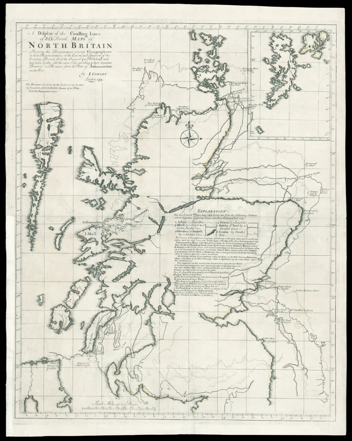 Shewing the Disagreement among Geographers in their Representation of the Extent and Situation of the Country. Drawn from the Originals (as Published) and laid down by One and the same Scale, according to their respective Bearings and Distances from the Point of Ardnamorchan on the West. [Together with] A New Map of North Britain, with the Islands thereunto belonging, done from some late Surveys of part of the East and West Coasts, and from Modern Accounts of the Country and other Authorities mentioned in the Explantion annexed Fol: (9). By J. Cowley, 1734.