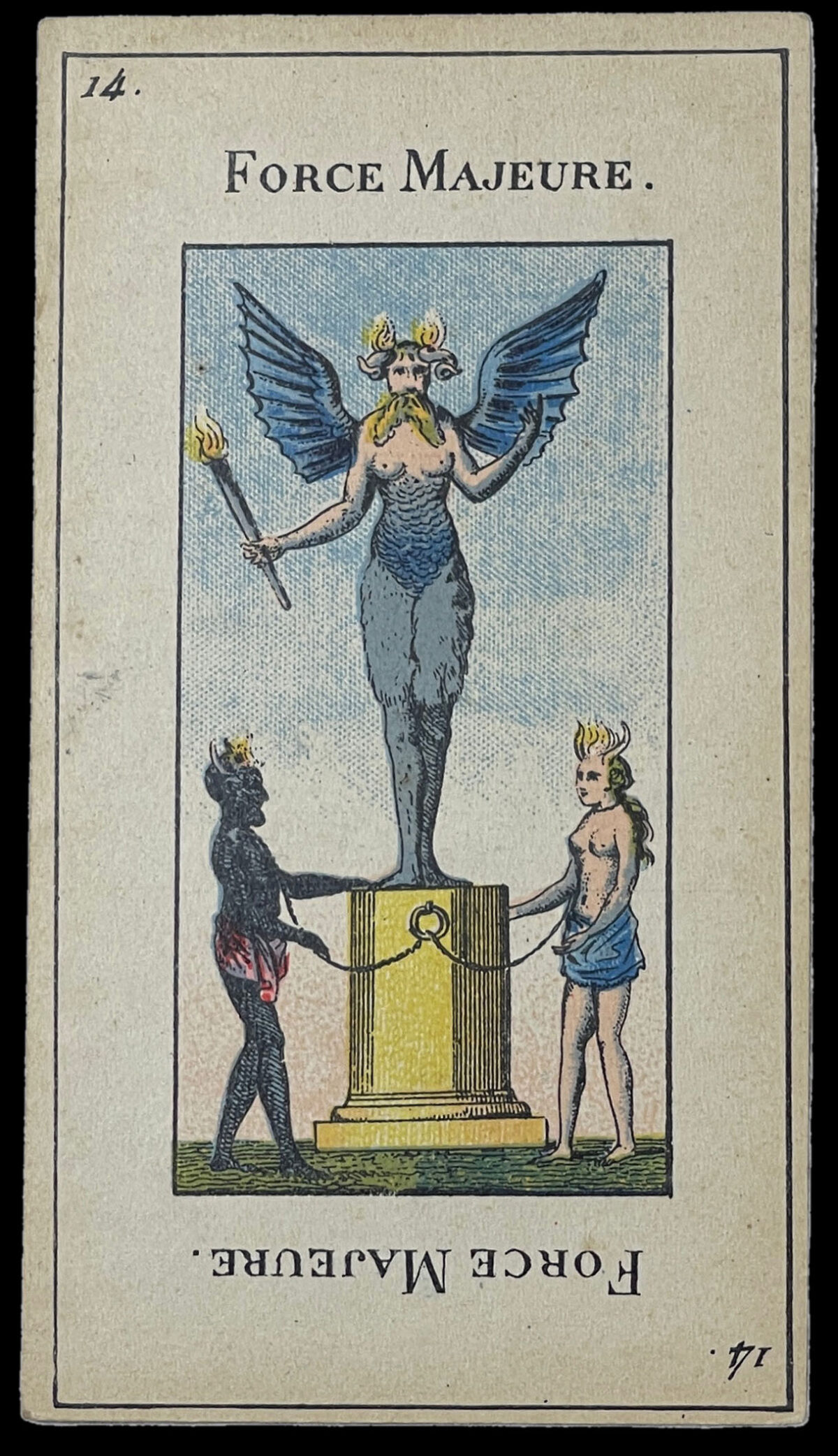 In 1789, he published his own deck of tarot cards which differed from the traditional Marseilles deck that had formed the body of much of his research, and which was widely disseminated in various editions throughout the following centuries. The present edition was published by B.P. Grimaud & Cie., which had been founded in 1848 as a small playing card factory in Paris, producing decks on a range of themes and subjects. The firm continued to prosper throughout the subsequent century, and in 1962 was bought by a larger company, Ducale-France Cartes. It continues today as part of the Cartamundi Group.