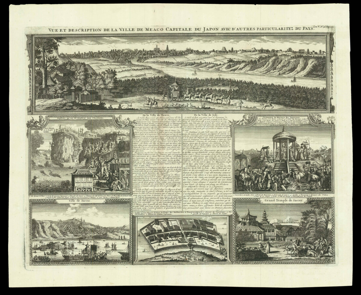 The French text in the middle described the cities of Kyoto and Tokyo. The views are of Kyoto, the Dutch settlement of Deshima, two views of the town and temple Sakai, a Japanese marriage ceremony, and the persecution of Christian martyrs. Deshima was the base of the Dutch East India Company and one of the few areas in which European traders were al...