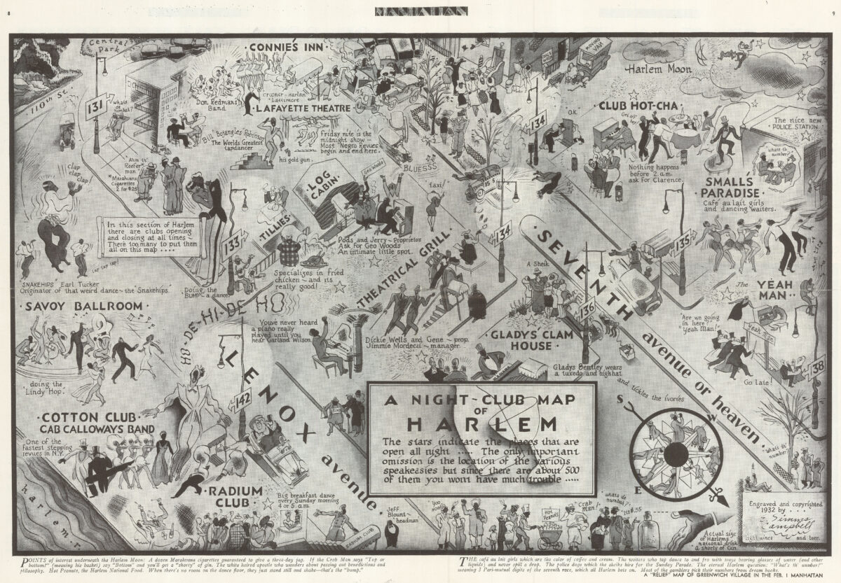 To succeed in a white-dominated society, Campbell, the first nationally-prominent African-American cartoonist, rarely used Black themes in his drawings. But he had close ties to Harlem's cultural "Renaissance" and this map was his most important early Black-related work, forgotten for decades because it appeared in the first issue of an obscure magazine for Manhattan night-owls which failed in a month.