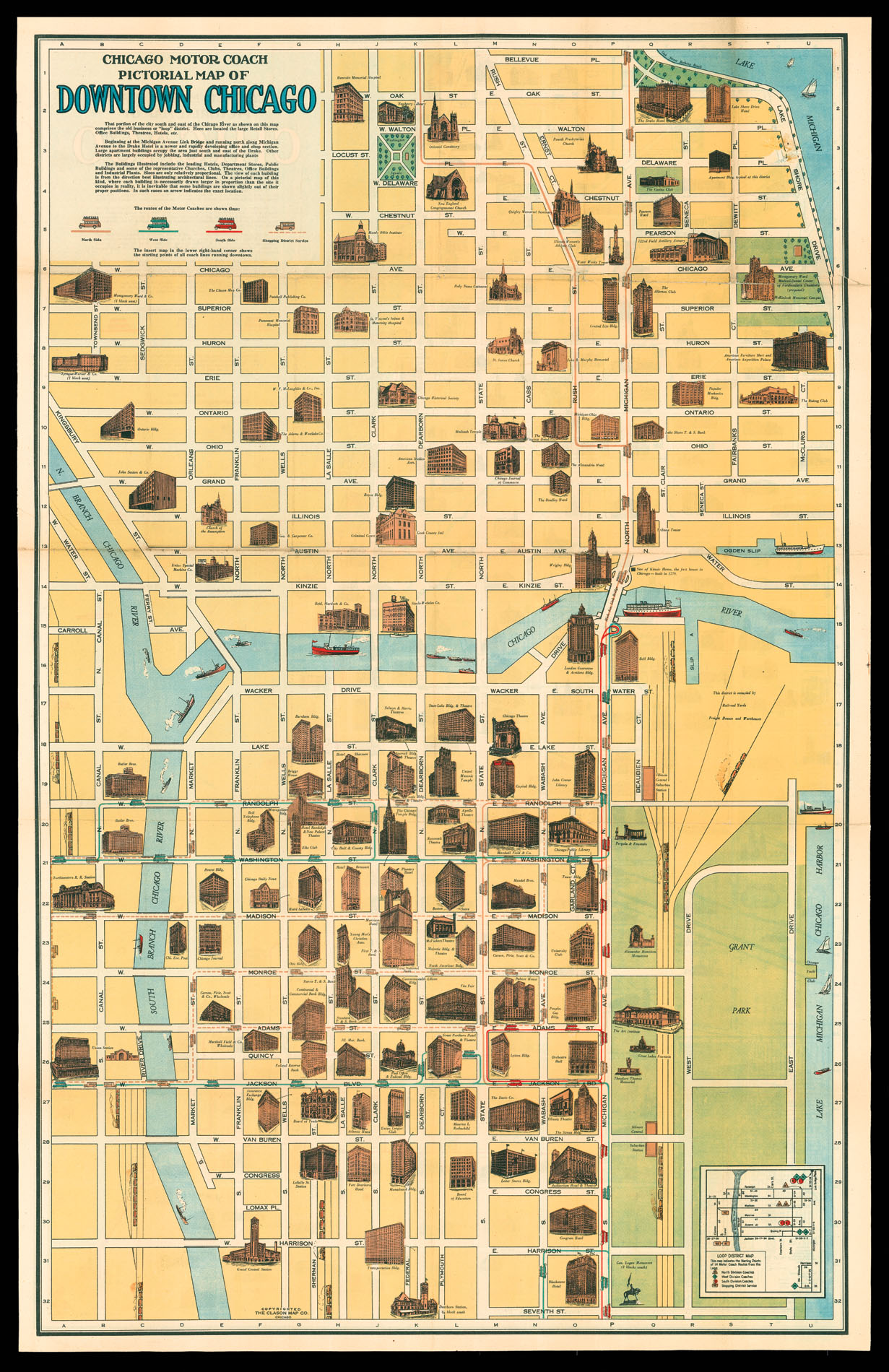 A promotional map of downtown Chicago. Famous buildings are shown in profile, including hotels, churches, theatres, and newspaper offices. The small inset diagram in the lower right corner shows the "Motor Coach Routes" in the Loop, the nickname given to the transport system ring in the city. The diagram is then reproduced on the map itself, with each route shown as a differently coloured line of dashes with small drawings of coaches.