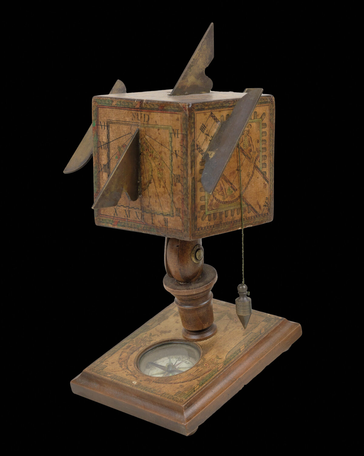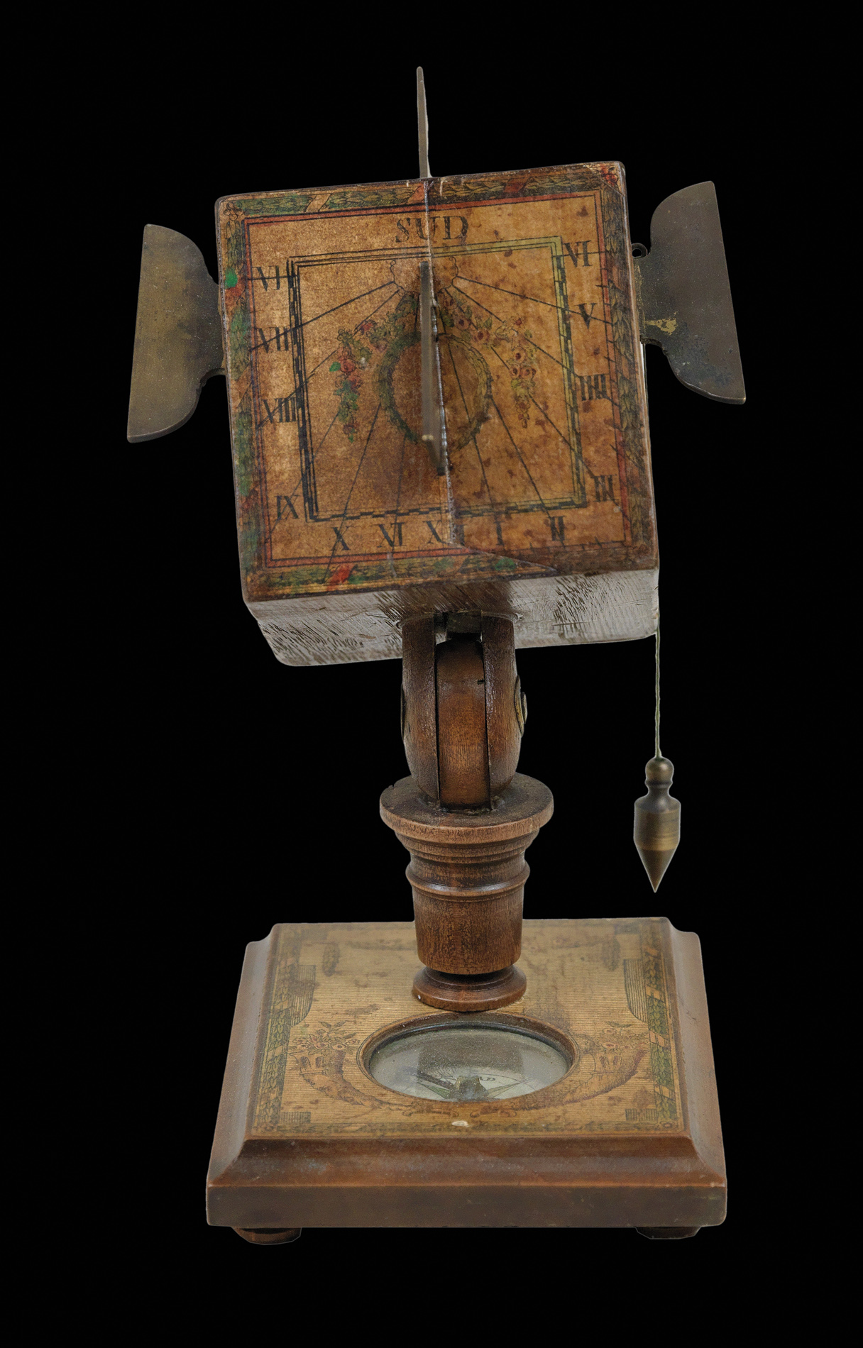 The sundial is made up of an articulated arm, surmounted by a cube with sundials and gnomons to all five sides. The arm allows the user to incline the cube in a north-south direction; a plumb line on the easte...