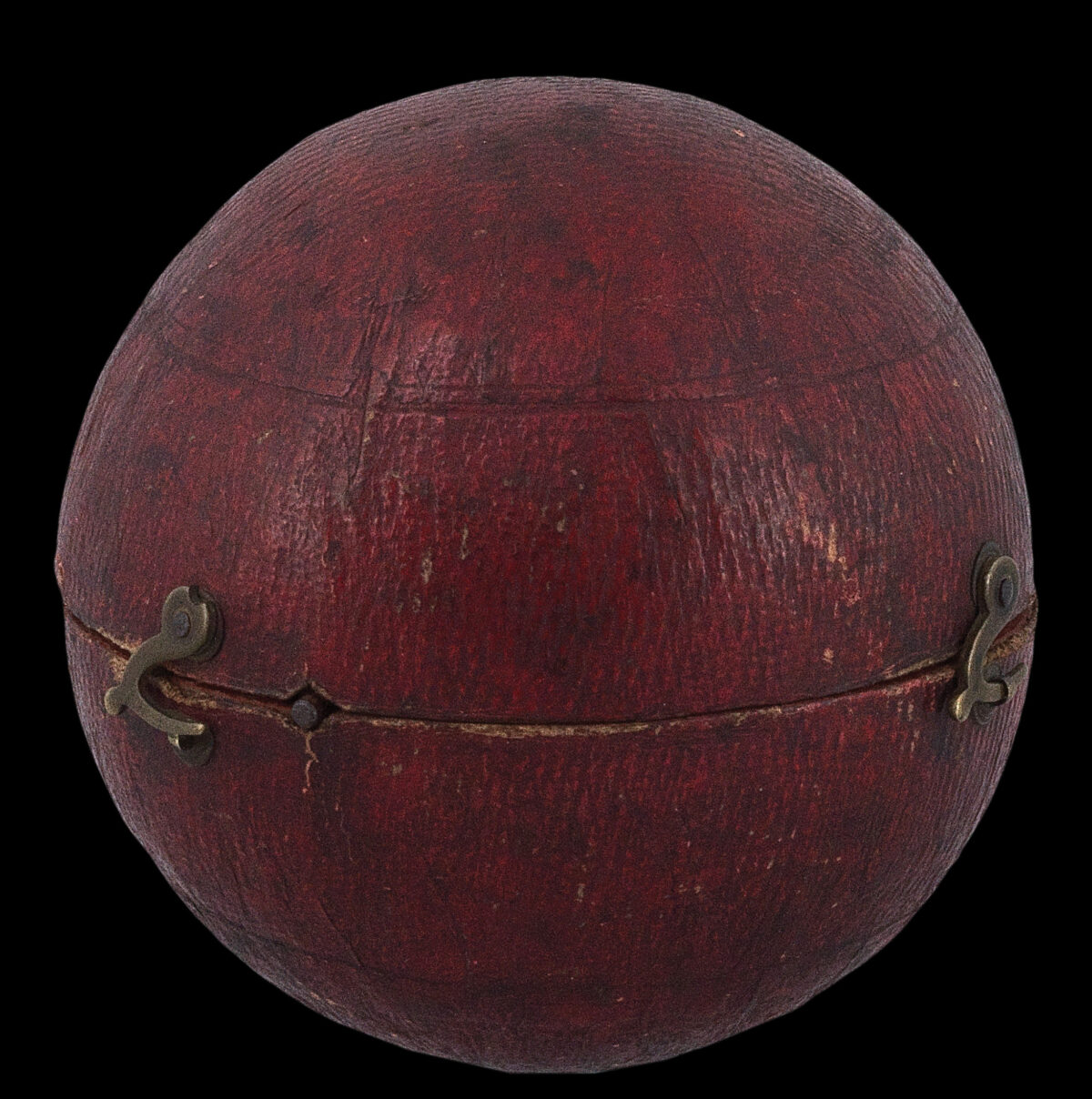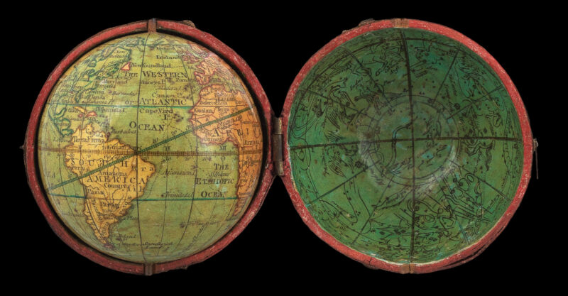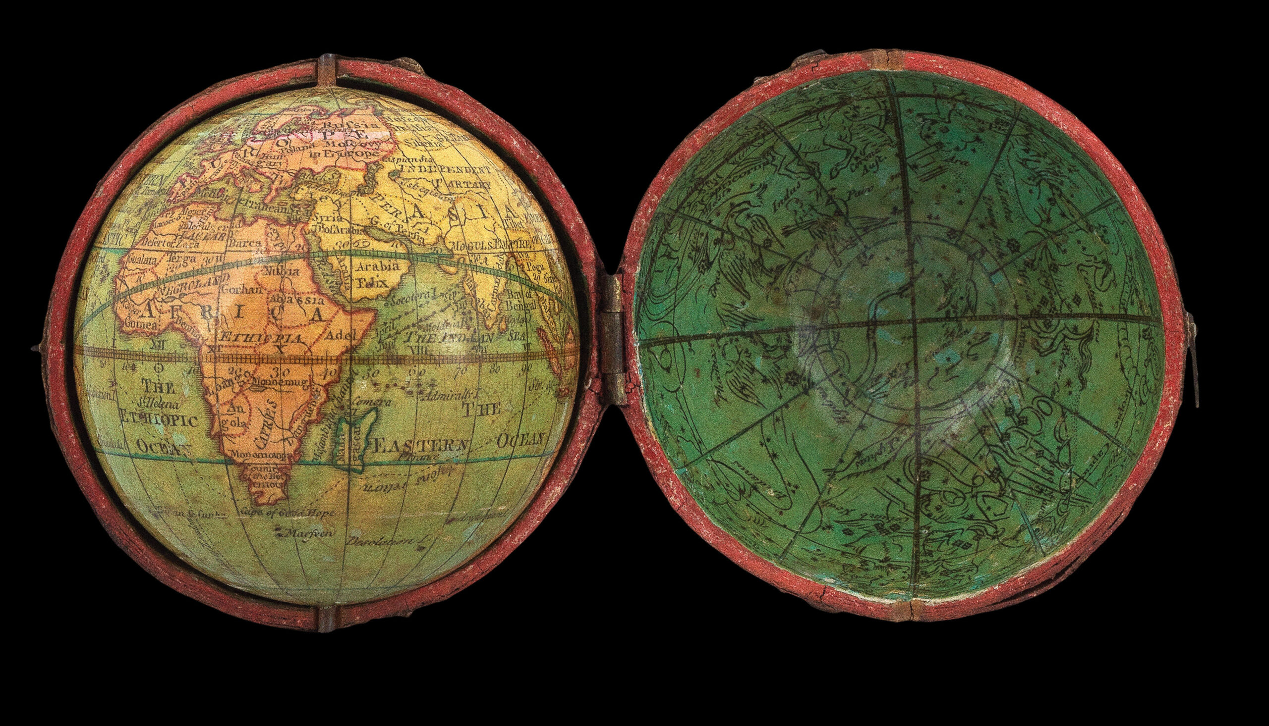 Globe, 12 hand-coloured engraved paper gores, clipped at 70 degrees latitude, with two polar calottes, over a papier mâché and plaster sphere, paste-over imprint to cartouche, varnished, housed in original red calf over paste-board clamshell case, with hooks and eyes, lined with two sets of 12 hand-coloured engraved celestial gores. Diameter: 70mm (2.75 inches).