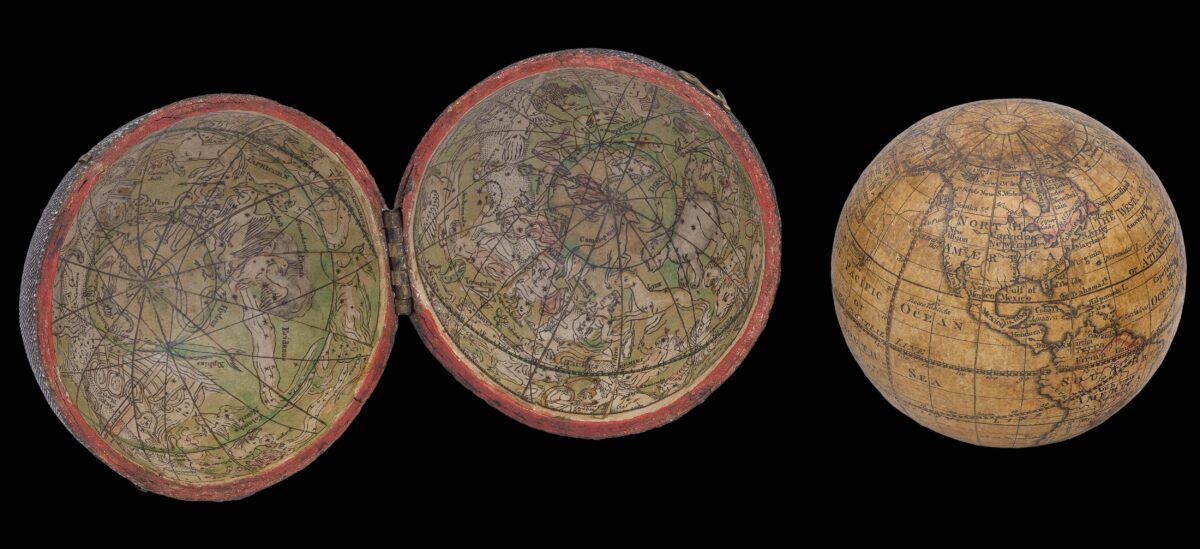 Globe, 12 hand-coloured engraved paper gores, clipped at 70 degrees, with two polar calottes, over a heavy metal sphere, housed in shagreen over paste-board clamshell case, rim painted red, with hook and eye, lined with 12 hand-coloured engraved celestial gores. The north and south poles with recent repairs and manuscript facsimile.