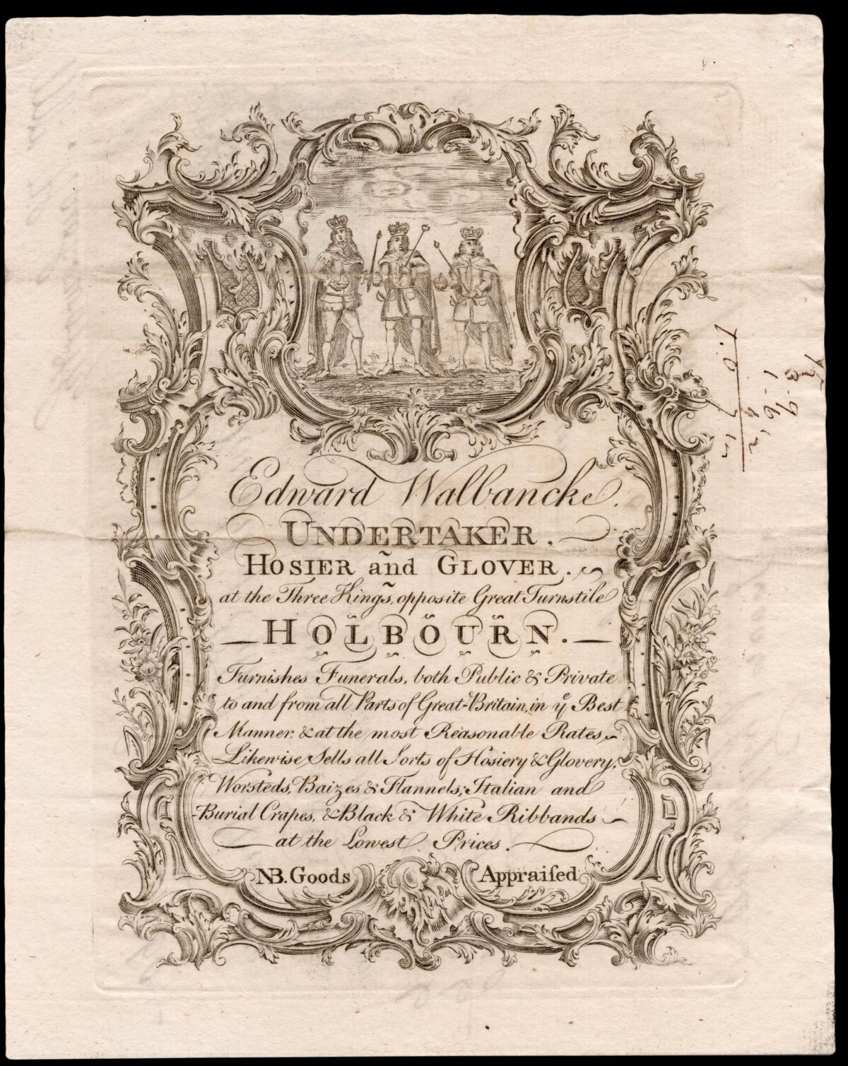 As an undertaker, Edward Walbancke was undoubtedly aware of his own mortality, as proven by the fact that he was included, in 1778 and 1783, in a 'List of the Members of the Corporation of the Amicable Society', which is considered the first life insurance company in the world. Sadly, Walbancke died at only 51 in 1784, upon which he was laid to rest in the family vault in Edmonton. According to the report in 'The Gentleman's Magazine', he was buried 'in great funeral pomp, ...