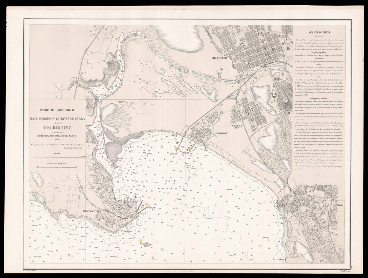 Cox's chart would become the template for all subsequent charts of Melbourne well into the mid-twentieth century. Its influence is shown by the present example, which is a French reproduction, first published two years after the original chart became available. Cartographically, it is identical to Cox's charts, with the same updates made from later surveys. Soundings are shown in metres, with the land relief depicted in hachures. Additional written information is included along the right side of the chart, explaining the soundings, tides and possible obstacles. To accomodate this text, part of the terrestrial map showing East Melbourne is sacrificed. This chart may have been produced to cater to the growing number of French immigrants to Australia. During the mid-nineteenth century, industry and agriculture in south-west France was stagnating, leading vast numbers to leave France in search of a more promising life in Australia. Similarly, the Industrial Revolution brought about the collapse of the silk-weaving industry that was dominated by Huguenots, meaning that many of these French refugees also sought the southern continent. There is evidence that much of Victoria's fertile land was transformed into vineyards at the hands of the French immigrants.