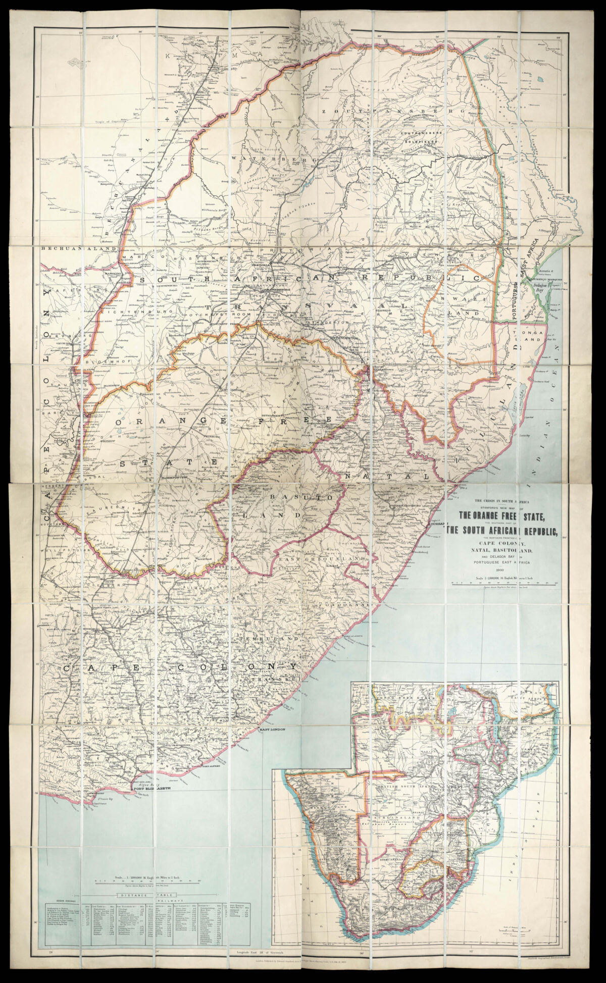 First issued in 1899, sometimes issued as two separate maps: of the Orange Free State; and the Southern Part of the South African Republic. With an inset of the southern tip of South Africa lower right and a table of distances lower left.