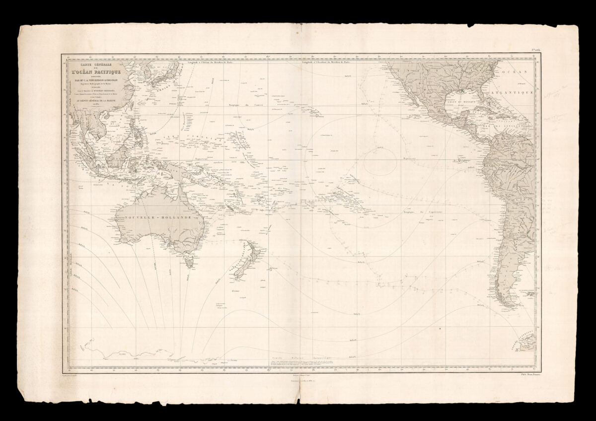 This large-scale chart, centred on the the Pacific Ocean, showing Southeast Asia, New Guinea, Australia, as "Nouvelle-Hollande", and the west coast of North and South America, with lines of magnetic declination, is annotated throughout with the route of an extensive voyage of a scion of the Freycinet family across the Pacific ocean during 1875 and 1876.