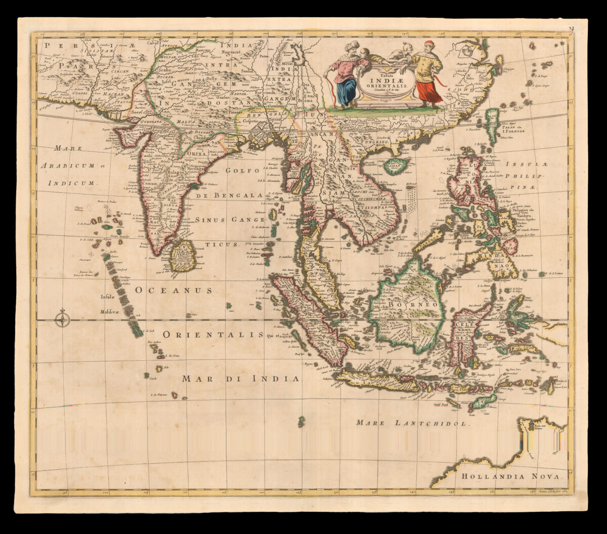 De Wit's comprehensive map of southern Asia clearly shows the extent of the Dutch East India Company (VOC)'s power in the region in the mid- seventeenth century and hints at the results of Tasman's second expedition of 1644. "The Republic's eastern trading domain is tangible here, with a fleet powering across the Indian Ocean, and its ships and ports in evidence from India to Japan. The map gives the impression of dominion over many nations, though in truth the Dutch 'empire' was less territorial than formalistic, a coastal network of strongholds backed by naval power and treaties that held little sway over interior lands" (Woods).