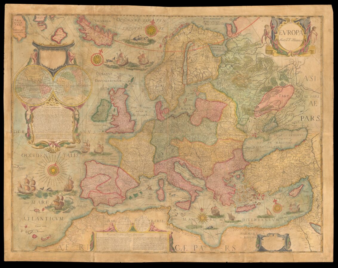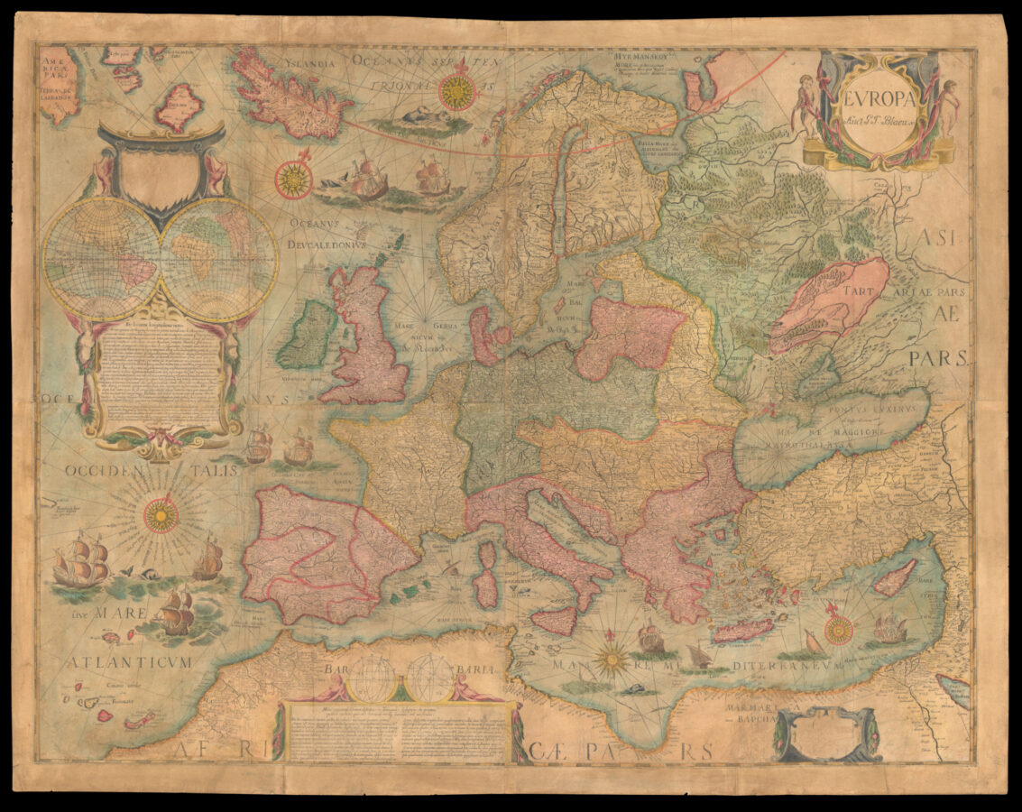 Europe The large cartouche features Hessel Gerritsz's double-hemispheric map, surmounted by the arms of the city of Amsterdam, a reference to Blaeu's official privileges. It explains Blaeu's position on the prime meridian, in which he rejects the magnetic declination method of determining longitude advocated by some of his contemporaries. The continuing difficulties of determining longitude at sea are partly why Blaeu has extended the Mediterranean too far horizontally.